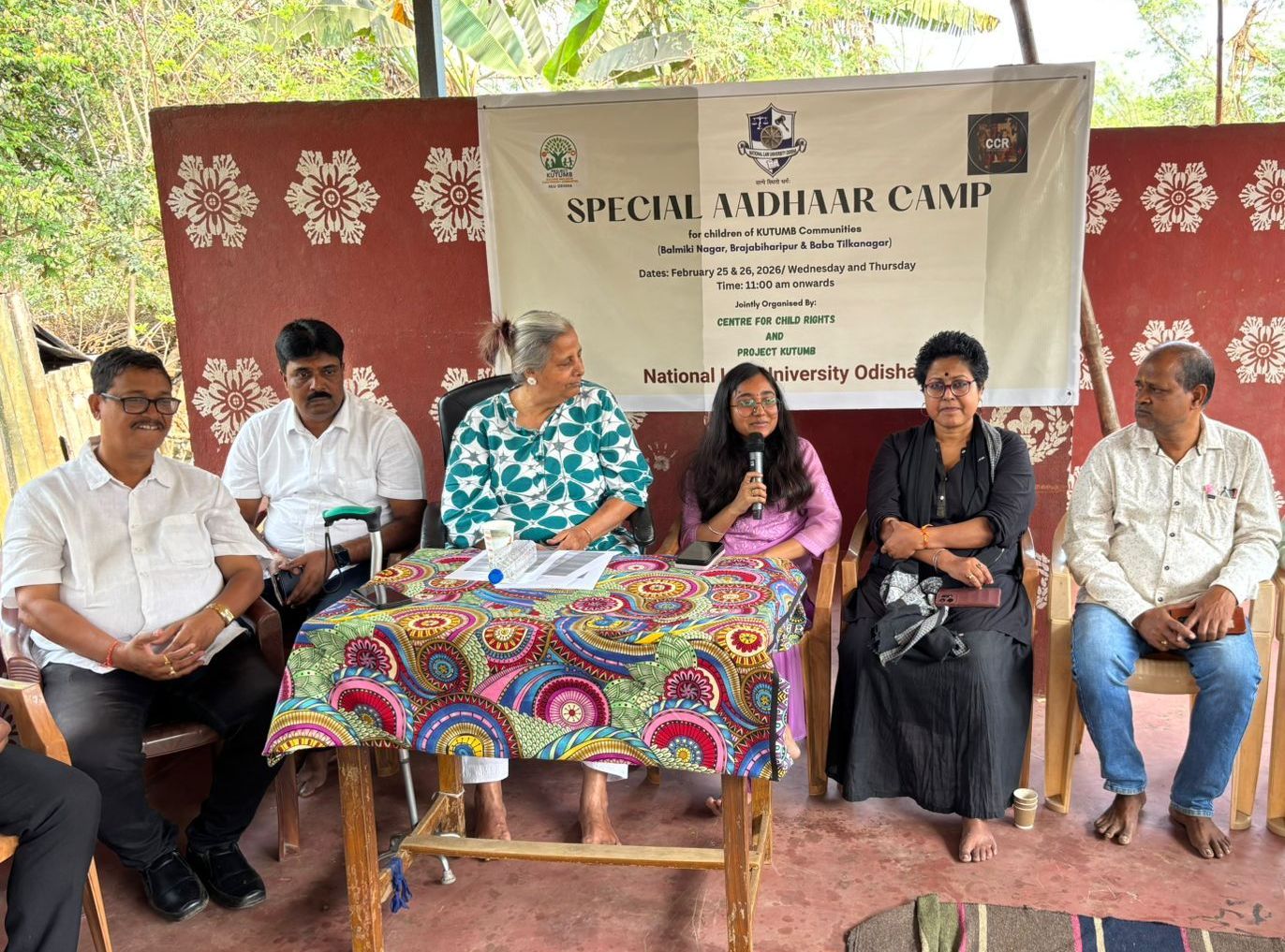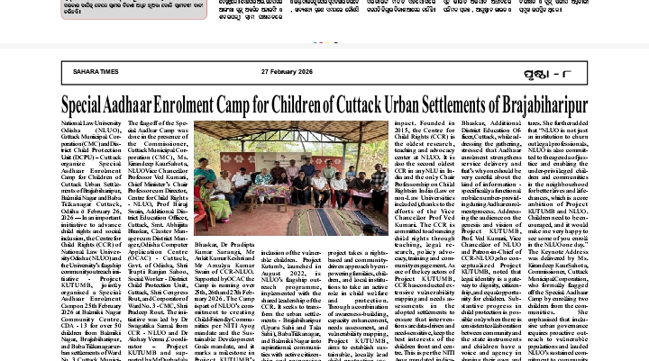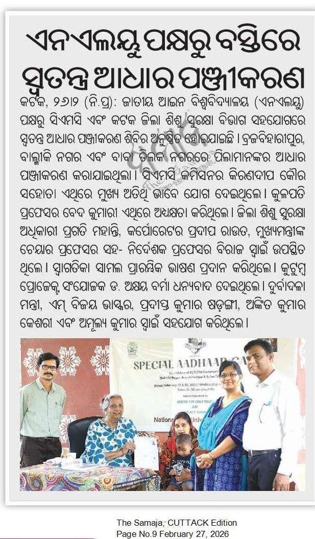 The flag off of the Special Aadhar Camp was done in the presence of the Commissioner, Cuttack Municipal Corporation (CMC), Ms. Kirandeep Kaur Sahota, NLUO Vice Chancellor Professor Ved Kumari, Chief Minister’s Chair Professor cum Director, Centre for Child Rights – NLUO, Prof Biraj Swain, Additional District Education Officer, Cuttack, Smt. Abhijita Bhaskar, Social Worker – District Child Protection Unit, Cuttack, Shri Congress Rout, and Corporator of Ward No. 3 – CMC, Shri Pradeep Rout. The initiative was led by Dr Swagatika Samal from CCR – NLUO and Dr Akshay Verma, Coordinator – Project KUTUMB and supported by Mr Durbadala Mantry, Mr M Vijay Bhaskar, Dr Pradipta Kumar Sarangi, Mr Ankit Kumar Keshri and Mr Amulya Kumar Swain of CCR-NLUO. The Camp is running over 25th and 26th February 2026.