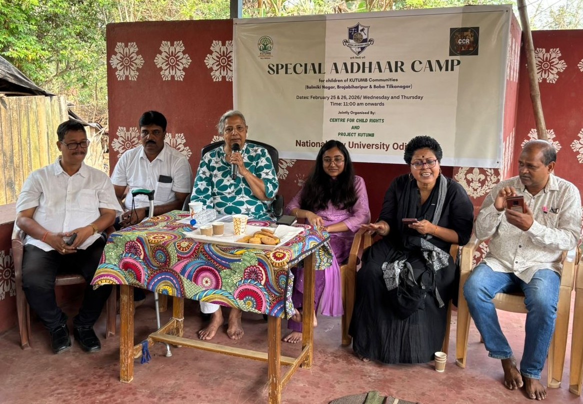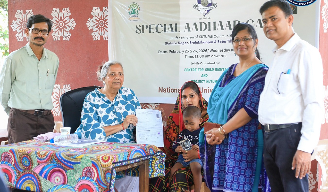 Cuttack, Odisha | February 26, 2026 — In an important initiative to advance child rights and social inclusion, the Centre for Child Rights (CCR) of National Law University Odisha (NLUO) and the University’s flagship community outreach initiative – Project KUTUMB, jointly organised a Special Aadhaar Enrolment Camp on 25th February 2026 at Balmiki Nagar Community Centre, CDA – 13 for over 50 children from Balmiki Nagar, Brajabiharipur, and Baba Tilkanagar urban settlements of Ward No. 3, Cuttack Municipal Corporation (CMC).