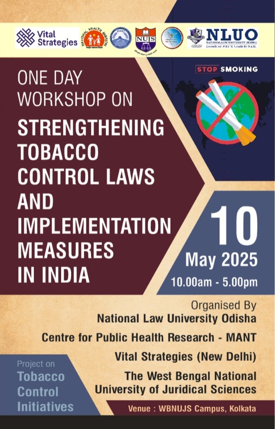 Workshop on Strengthening Tobacco Control Laws And Implementation Measures In India by National Law University Odisha to be held on 10th May 2025 at WBNUJS